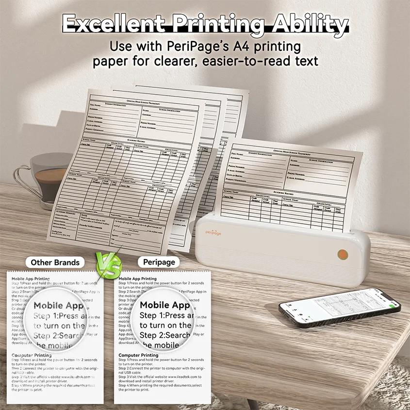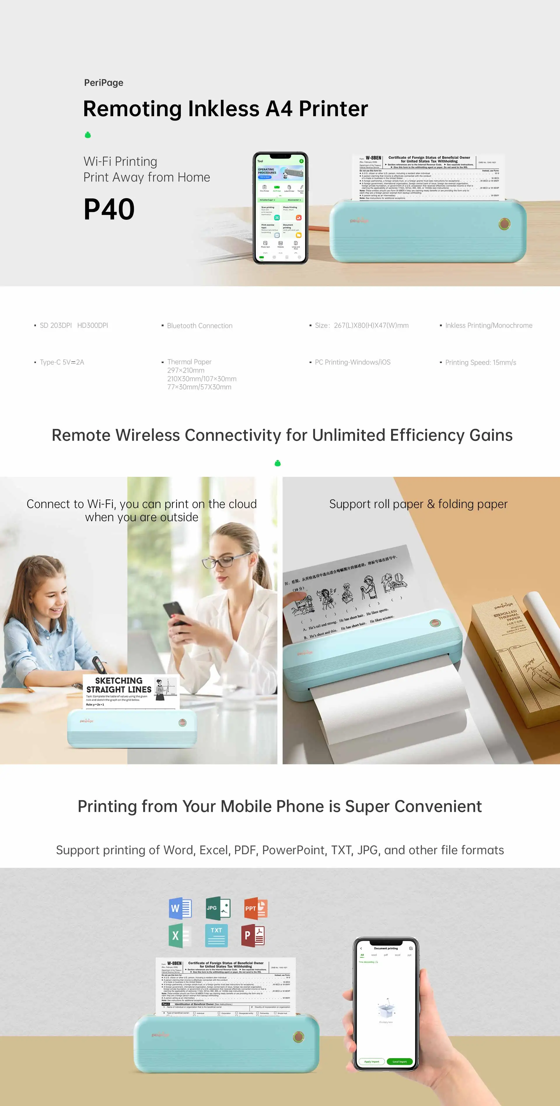 Peripage P40 A4 Portable Thermal Printer Wireless Mobile Photo Printer Mini Wireless Mobile Thermal Printer